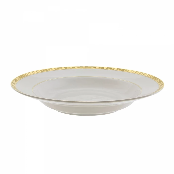 The festive looking Ten Strawberry Street Athens Gold ATH-3G 8 oz. Rim Soup Bowl is stylish and elegant, featuring a lovely two-tone gold patterned band on the rim. This high quality, dishwasher safe soup bowl, is an excellent choice for caterers and restaurateurs to use when serving guests at banquets and formal dinners.