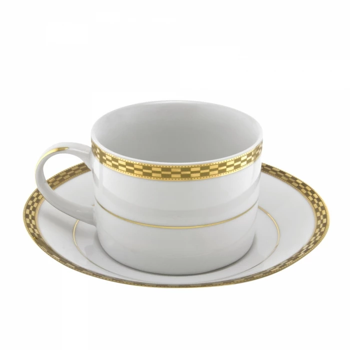 The festive looking Ten Strawberry Street Athens Gold ATH-9G 8 oz. Can Cup and Saucer Set is stylish and elegant, featuring a two-tone gold patterned band on the rim. This can shaped, dishwasher safe cup and saucer set, is an excellent choice for caterers and restaurateur to use when serving guests at banquets and formal dinners.