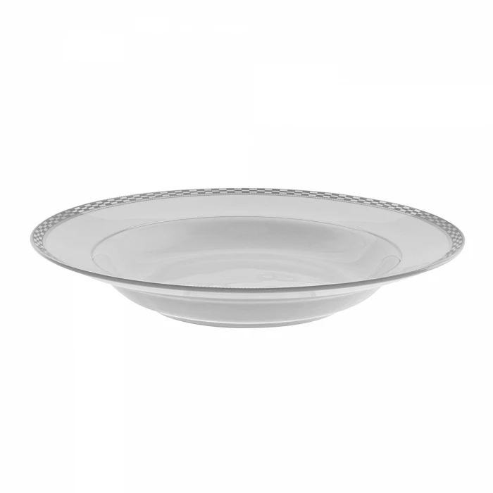 The festive looking Ten Strawberry Street Athens Platinum ATH-3P 8 oz. Rim Soup Bowl has an exquisite design featuring a two-tone silver pattern on the rim that creates a charming and elegant aura. Soup will look most enticing nestled in the elaborate design of this soup bowl. This bowl is dishwasher safe so that it can be ready quickly for your next meal service or affair.