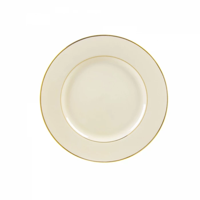 Use the Ten Strawberry Street Cream Double Gold Line CGLD0004 7-3/4″ Salad / Dessert Plate to create an appetizing palate for your guests. A festive and original alternative to white, this cream colored plate, decorated with delicate gold lines, is sure to entrall your guests. This plate is lead free, and dishwasher safe.