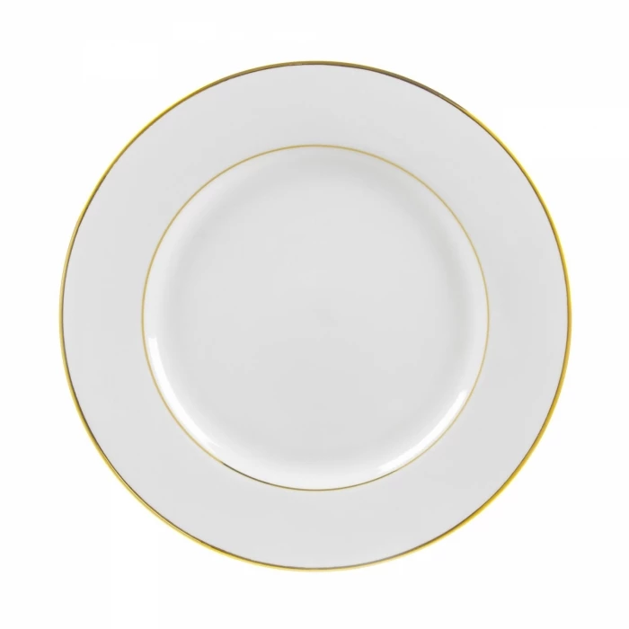 Highlight your culinary delectables using the Ten Strawberry Street Double Gold Line GLD0001 10-3/4″ Dinner Plate. This large bright white plate, with festive gold rims, will make food presentations appear rich and delicious. This plate is lead free and dishwasher safe.