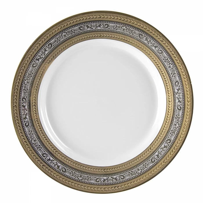 The ornate Ten Strawberry Street  ELE-24 Elegance 12″ Porcelain Charger Plate will help to create an impressive table setting. The rim of the plate is decorated with an intricate design of gold and silver that will make transitioning between courses a first class experience. Use this charger plate with this set, or match with another set to create astounding place settings. This plate is dishwasher safe.