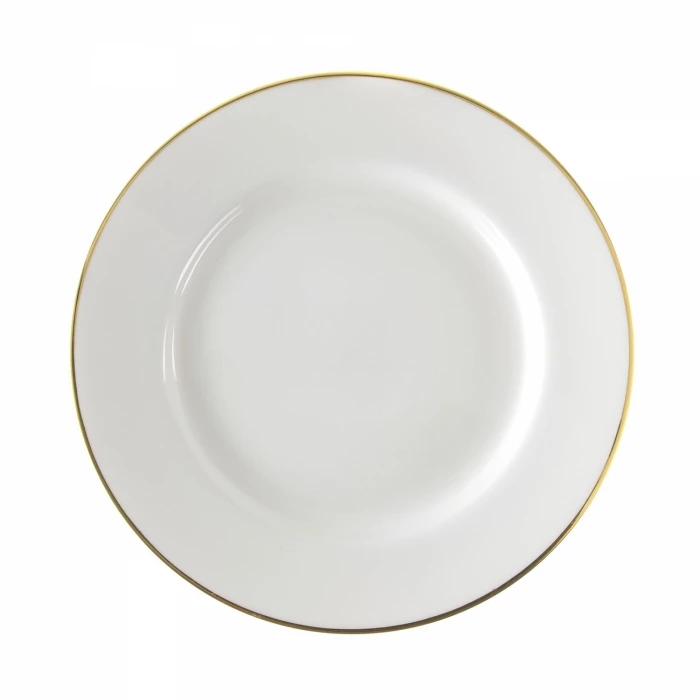 The gold line along the rim of the Ten Strawberry Street GL0001 10-3/4″ Gold Line Rim Dinner Plate will frame the gourmet food that you serveat the table. Perfect when catering a formal affair, or for use in upscale restaurants and hotels, this porcelain white plate is a durable choice for any first-class food service operation. It is also lead free as well as dishwasher safe, making clean-up easy.