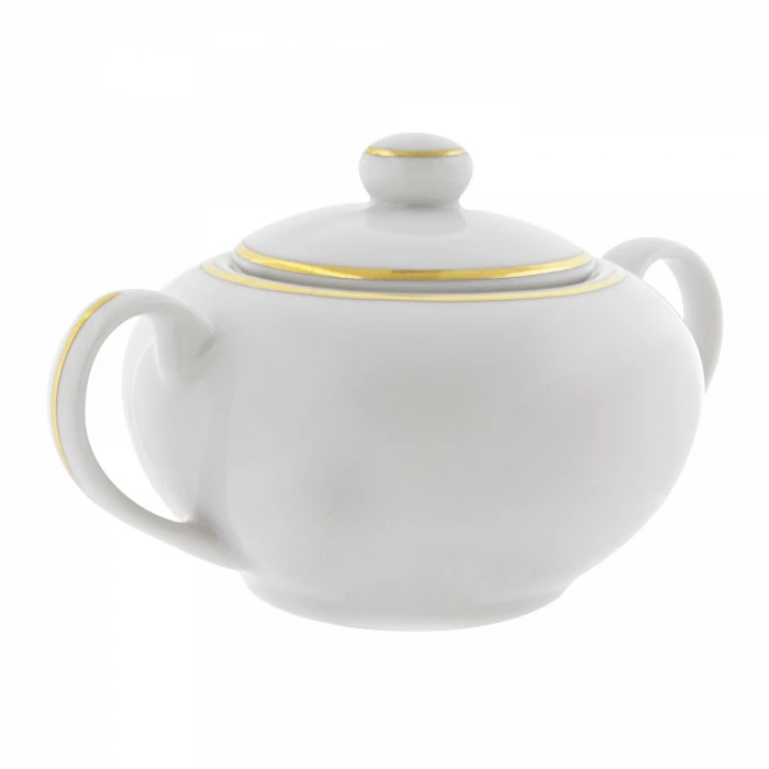 This Ten Strawberry Street Gold Line GL0018 8 oz. Rim Sugar Bowl with Lid is a classic piece suited to any formal affair. This white sugar bowl is adorned with a delicate gold line on the rim, lid and along the handles, that provides a most elegant effect. This sugar bowl is completely lead free and dishwasher safe for easy clean-up.