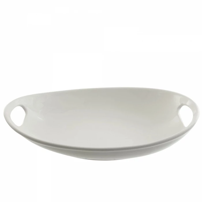 This bright white, Ten Strawberry Street Oslo OSLO-18SHLWHNDBWL Oval Handle Platter 18-1/4″ x 12-3/4″ is made from oven-ready, commercial grade porcelain, and features built-in handles that allow you to serve food straight from the oven to the table. This upturned bowl is decorated with concentric ridges around the center that gives it a stylish and eye-catching look that will coordinate well with any type of china dinnerware. It is also microwave, dishwasher and oven safe up to 500 F.