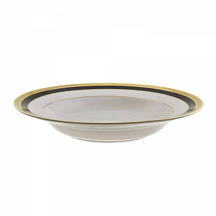The 10 Strawberry Street SAH-3BK Sahara Black Rim Soup Bowl 8 oz. is an eye-catching addition to your dinnerware collection. Adding modern elegance to any decor or table setting, this soup bowl boasts a gold and black pattern with a decorated border. Crafted from exceptionally durable porcelain, this soup bowl has a delicate look but is strong enough to endure daily use.