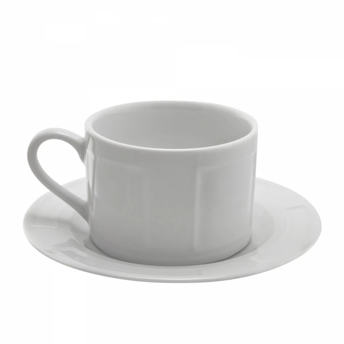 Serve your guests espresso or hot chocolate in style using the 10 Strawberry Street SORR0009 Sorrento White Cup and Saucer 9 oz. This set includes a straight-sided cup and a saucer that is accented with decorative rim embossing for a timeless yet elegant look. Crafted from porcelain, this cup and saucer set is resistant to stains and has a dishwasher, microwave, and oven-safe design.