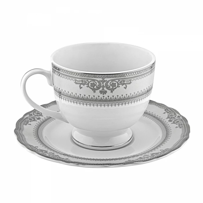Add an elegant edge to your hot beverage service with the 10 Strawberry Street VAN-9P Vanessa Platinum Cup and Saucer 8 oz. Beautifully accented with a detailed ornate design in platinum, this cup and saucer set is an excellent addition to any cafe, hotel, or restaurant. The matching saucer provides a sophisticated backdrop for cookies and biscotti. For outstanding durability, this cup and saucer set is made from stain-resistant and dishwasher-safe porcelain.