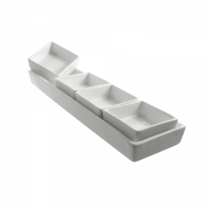 The 10 Strawberry Street LEX-4PKTCDMNT Whittier Rectangular Tray 11-1/4″ x 3-1/4″ is a versatile piece that is perfect for serving a variety of sauces and sides simultaneously. Featuring four removable modular dishes and beautifully crafted from pristine white porcelain, this tray provides delicate charm while being oven-ready, dishwasher safe, and stain resistant.