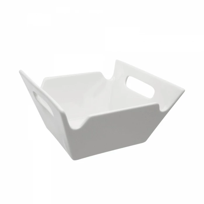 The 10 Strawberry Street WTR-10SQHNDLBWL Whittier Square Bowl with Handles 88 oz. is an excellent plating option for any breakfast, lunch, or dinner entree. Designed with angular sides and built-in handles this square bowl offers a modern yet elegant appeal that is suitable for both casual and formal dining. Delicate-looking but exceptionally durable, this square bowl with handle is made from dishwasher, microwave, and oven-safe white porcelain.